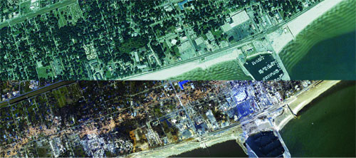Before and after images of Gulfport provide a striking contrast. The left photo is a QuickBird image; the right is from a NOAA post-Katrina flight.