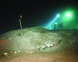 On Woolsey’s recent trips to assess methane hydrates in the Gulf of Mexico, Slattery’s ocean biotechnology group shared the research vessel. The seabed group tested its vertical sensor array in the water column, studying the gases vented to the surface by a hydrate deposit. Woolsey’s group used a submarine to study the seafloor, and then Slattery’s group used the submarine, which was outfitted with a claw, to collect samples that are extremely promising as potential medicinal agents.